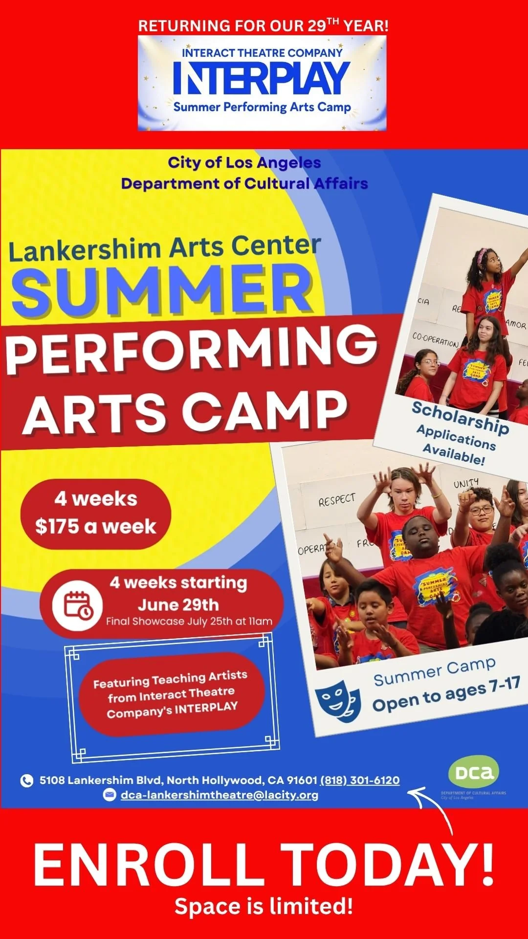 Our annual summer theatre workshop offers kids 7 - 17 an opportunity to explore live theatre through games, storytelling, music, acting, art, writing, singing, dancing, and improvisation. This year, we are honored to once again partner with the City of Los Angeles Department of Cultural Affairs to present a five-week day camp at Lankershim Arts Center, June 16 - July 19.
