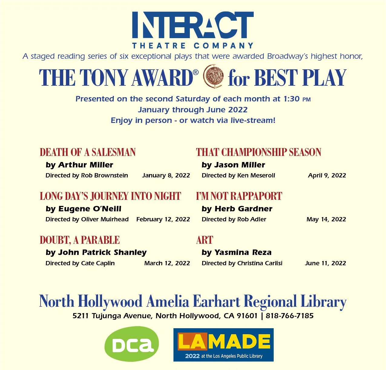 Get ready for an extraordinary season of world-class theatre as INTERACT THEATRE COMPANY, the 2023 Best Ensemble honoree by the Los Angeles Drama Critics Circle, joins forces with the LOS ANGELES PUBLIC LIBRARY to bring you the fourth sensational season of The Prize Winners! This celebrated series of free staged readings showcases the best in dramatic storytelling with Pulitzer Prize and Tony Award®-winning plays. Produced by Barry Heins and Kristen Egermeier, The Prize Winners is a proud centerpiece of the LA MADE cultural enrichment program, and is supported by Friends of the Studio City Library and the City of Los Angeles Department of Cultural Affairs.